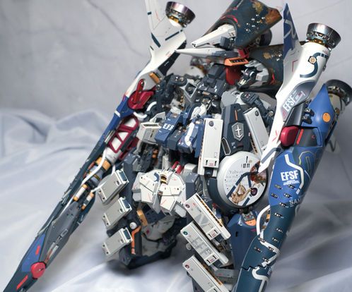 The overall design language follows the equipment design of the MTR-01S, such as the rectangular armor at the front. On the other hand, the giant thrusters on both sides use HG's Kshatriya as the base shape-molding embryo and are paired with Epoxy Putty to create parts with geometric aesthetic excesses. The knees and multiple parts take an exaggerated design approach. The color scheme is boldly painted with irregular and striped patterns. The gold leaf